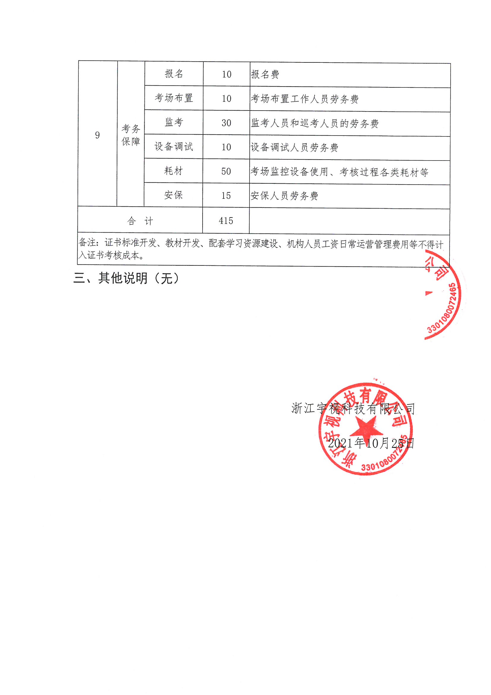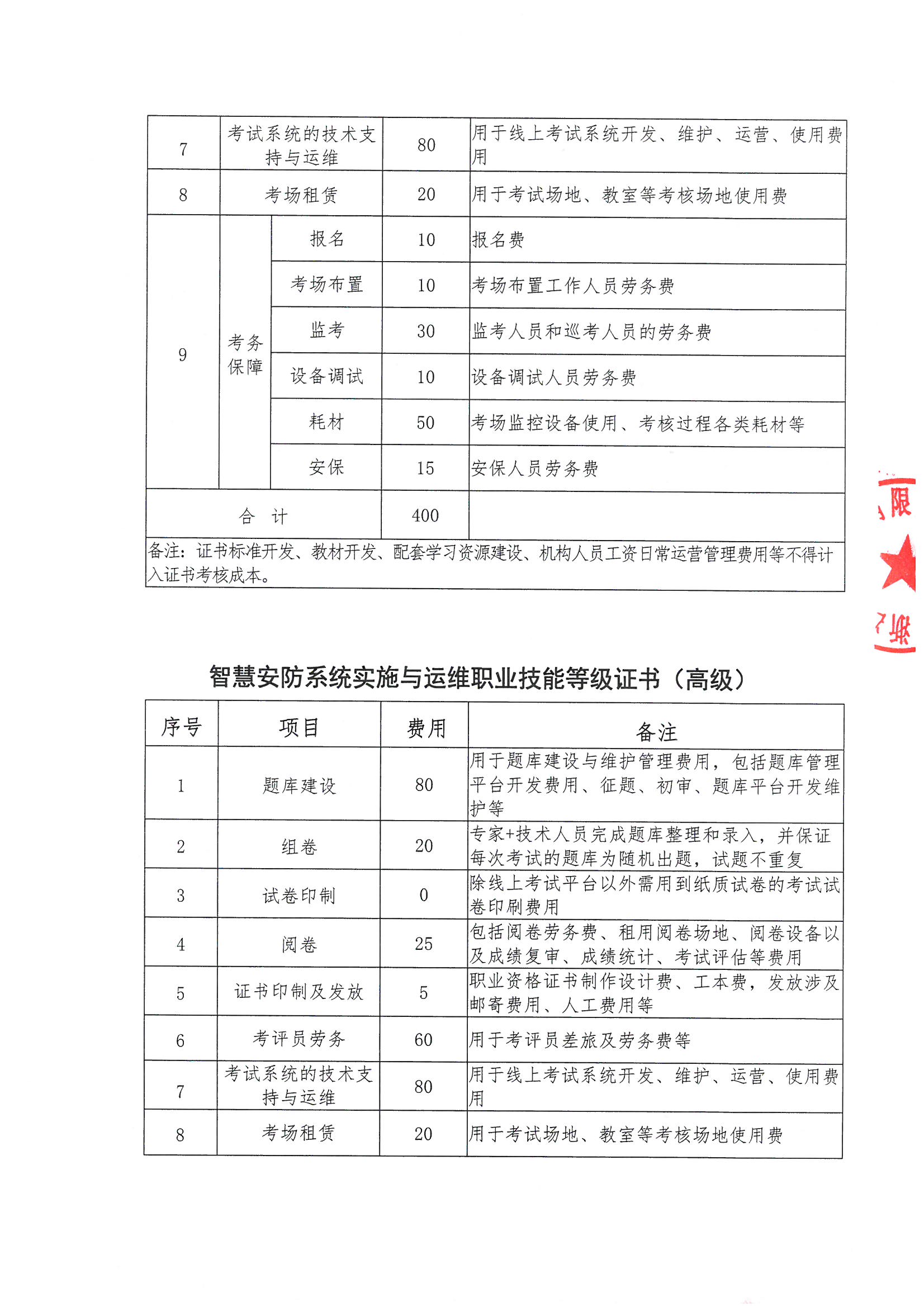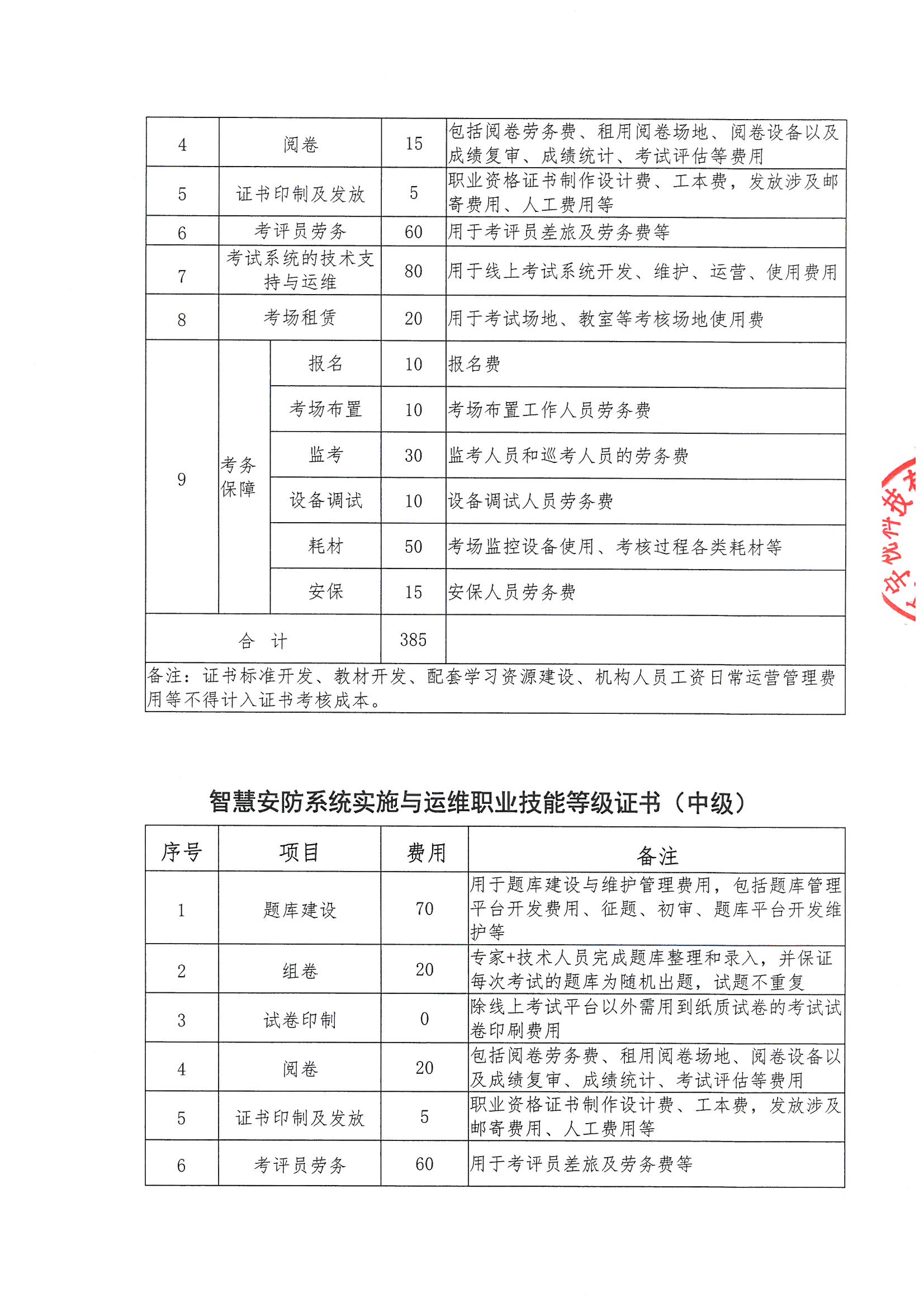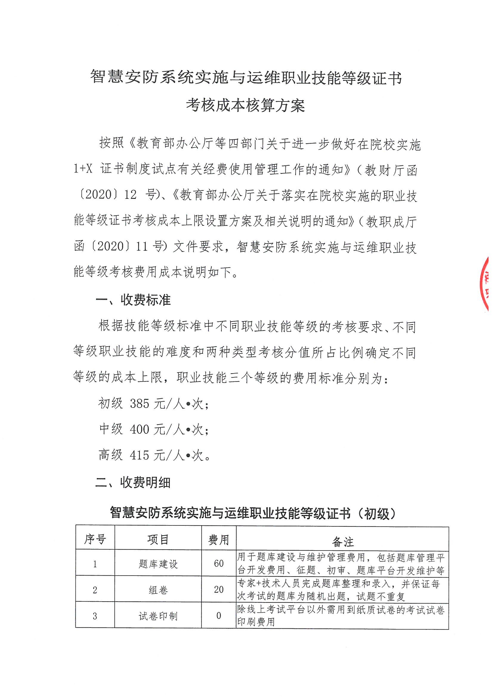 全国-智慧安防系统实施与运职业技能等级证书考核费用项目明细表
