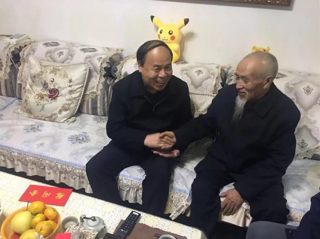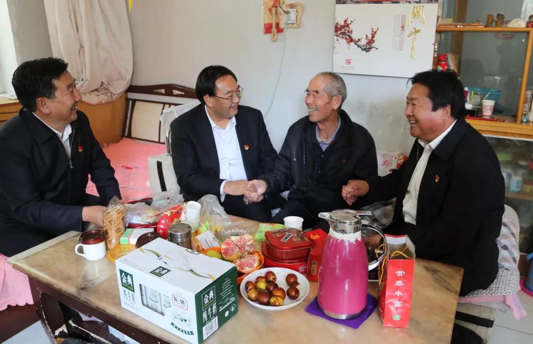 图为集团公司党委书记、董事长马荣华到贵南草业公司退休老党员王振山家中走访慰问。