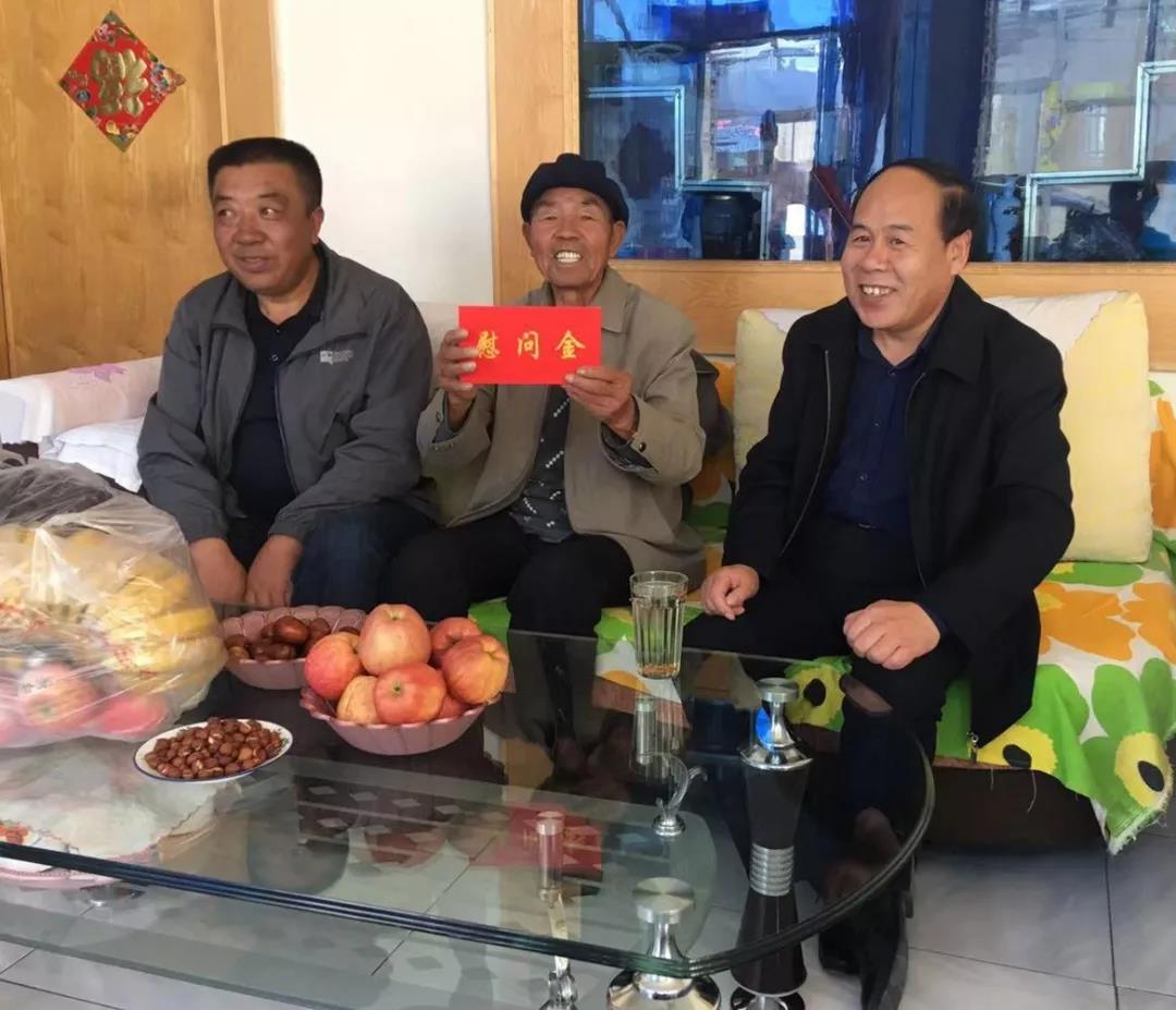图为集团公司党委书记、董事长马荣华到贵南草业公司退休老党员王章银家中走访慰问。