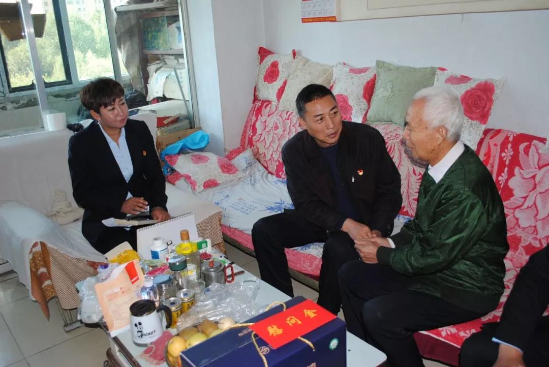 图为集团公司党委副书记、总经理李向阳到牧草良种繁殖场退休老党员李广珊、王玉芳家中走访慰问。